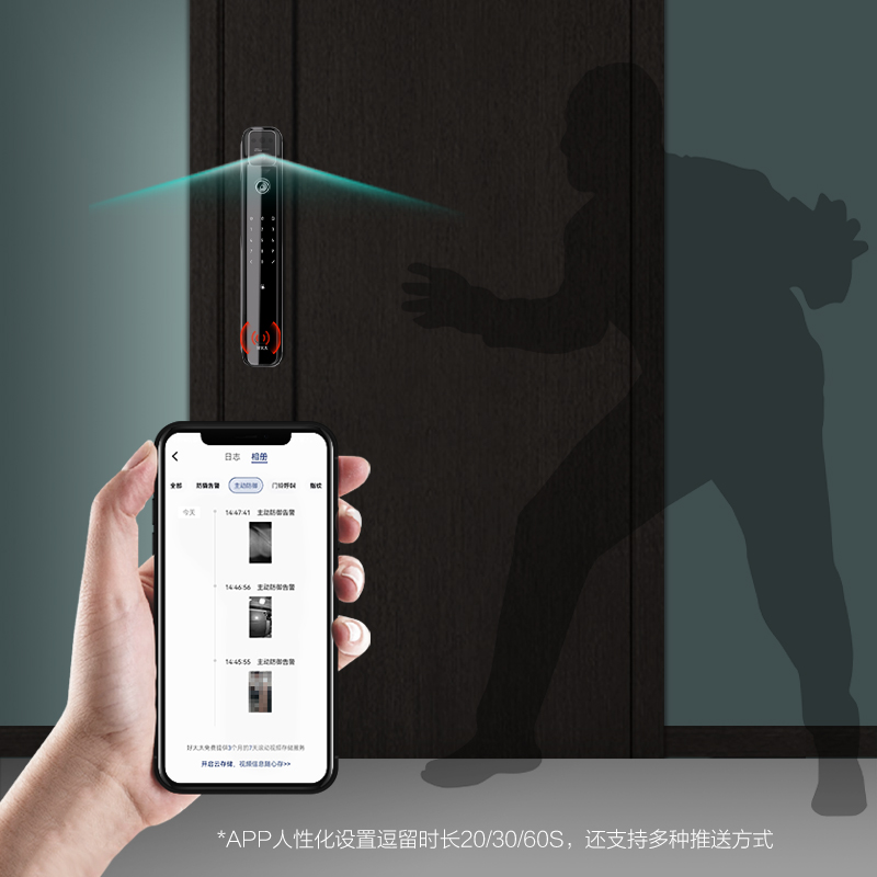 搭载红外传感器,门外感应1米范围,陌生人异常逗留即会触发侦测抓拍并推送实时拍摄的图片到手机